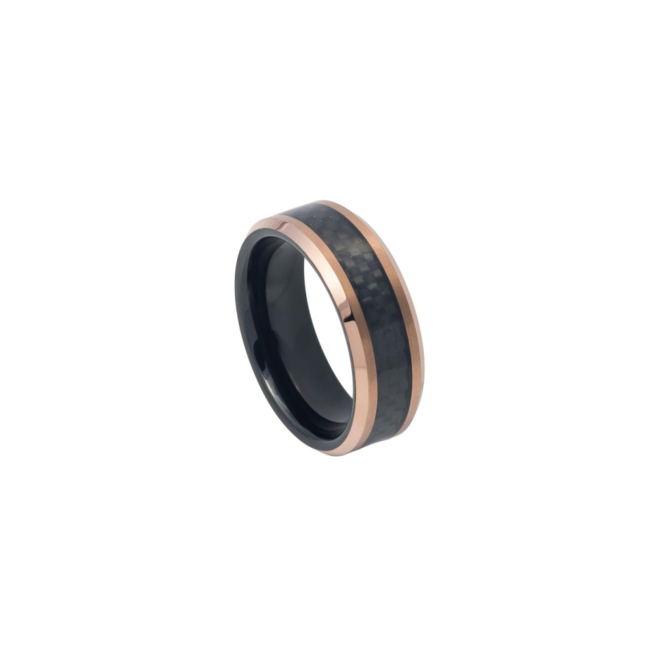 Tungsten Ring Two-tone Rose Gold IP Finish, Inlayed with Black Carbon Fiber